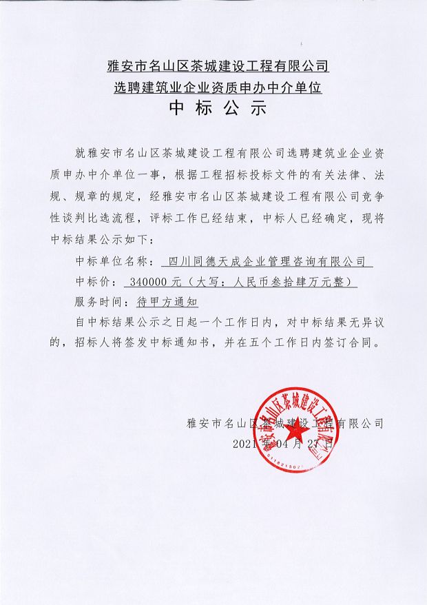 選聘建筑企業(yè)資質(zhì)申辦中介單位中標(biāo)公示
